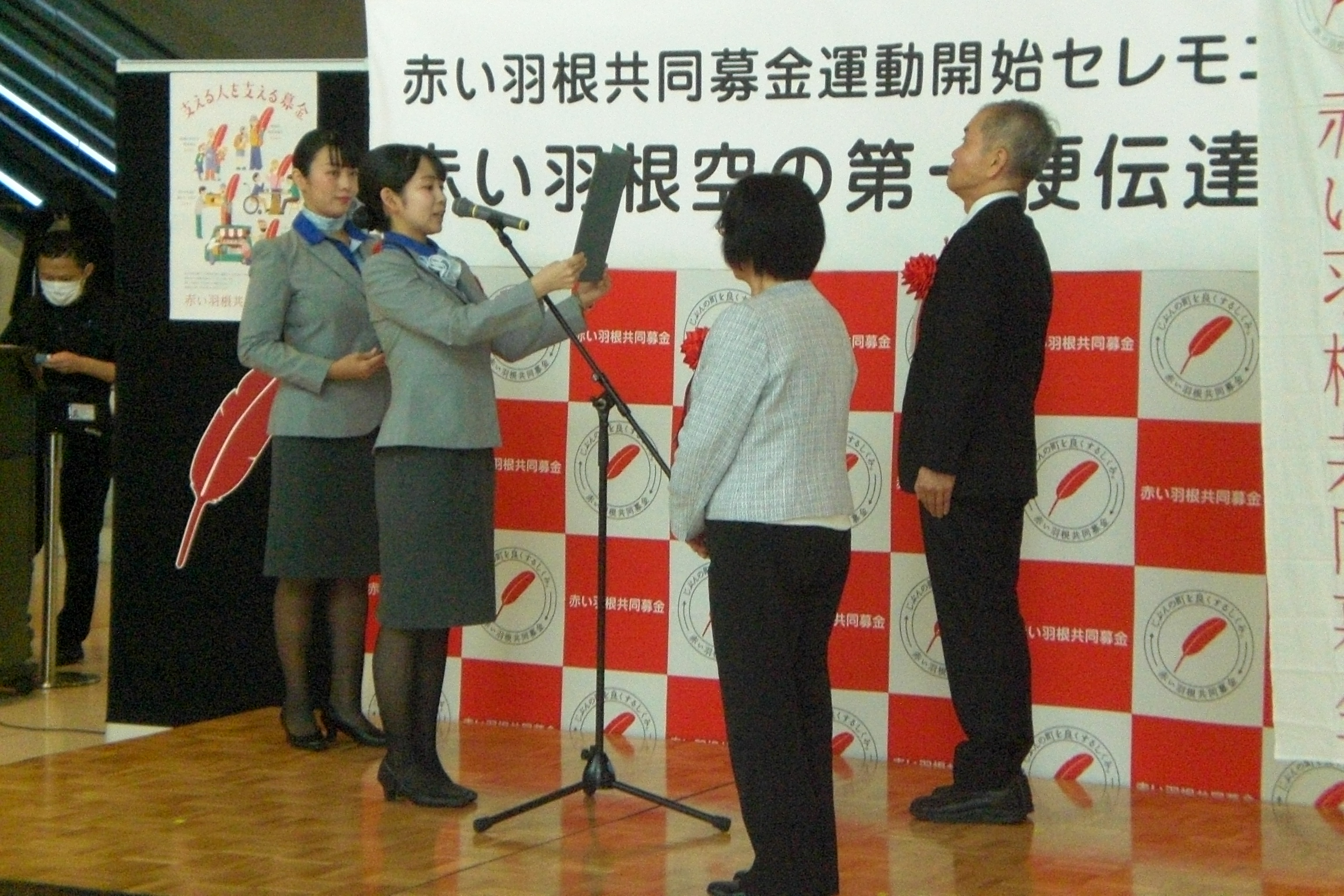 セレモニーでは、恒例の「空の第一便伝達式」が行われ、厚生労働大臣メッセージと中央共同募金会長メッセージがANA(全日本空輸)のスタッフから届けられました。